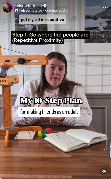Dish, you write a lot about friendships — making, auditing and cherishing them at this stage — so I thought CRUSH Readers might appreciate this clip on making friends from Instagram influencer Kelsey Pomeroy. She mostly gives “practical Mom” tips on her page, which is a stage I am well past (thank god), but this one applies to us, too.