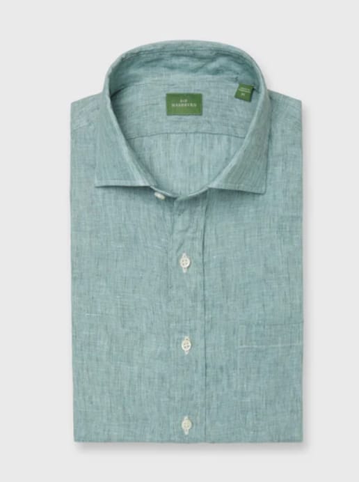 Sid Mashburn’s spread collar linen shirt in Thyme (L) and Todd Snyder’s linen camp shirt (R)