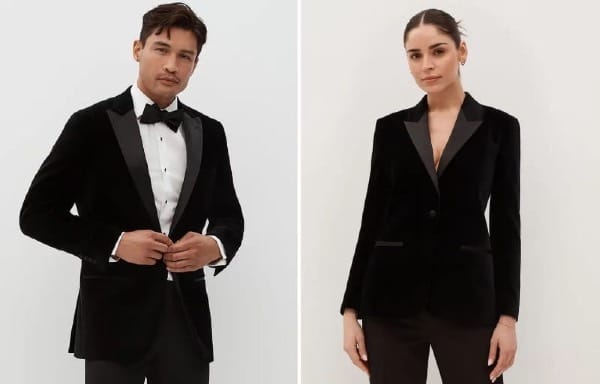 Below are the SuitShop versions that I bought for my nephew and me last year. I got the black velvet peak label jacket ($299) for him as a Christmas/birthday gift and the women’s version ($299) for me. (No, we didn’t attend anything together in our coordinated velvet jackets.)