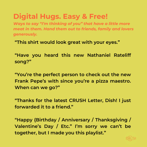 It is like the “too-short a sheet” analogy Dish made in a recent Crush Letter. {TheCrush Letter No 99.} In life, you are given a sheet that’s too short. You have to choose what stays warm. My choice is to be wrapped in the blanket of warmth I get from being part of my family’s structure. But my arms are shivering without someone to hold. That’s life.