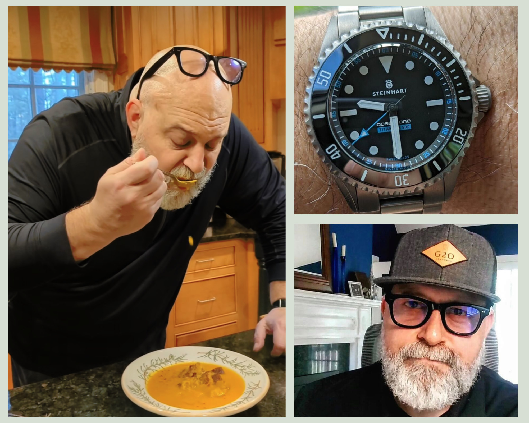 When you’re not checking out his watch collection, you may want to pick up tips on making steak chili, bolognese or Zuppa di Farro.